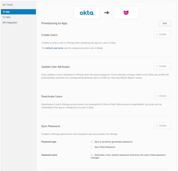 After adding H5mag from the Okta OAN, you will need to set up the API connection. Click the 'Edit' button in the 'API Integration' page of the Provisioning tab. Now enter the following data: