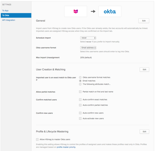 The 'To Okta' page should be set to never import users from H5mag, as all user management should occur from the Okta system.