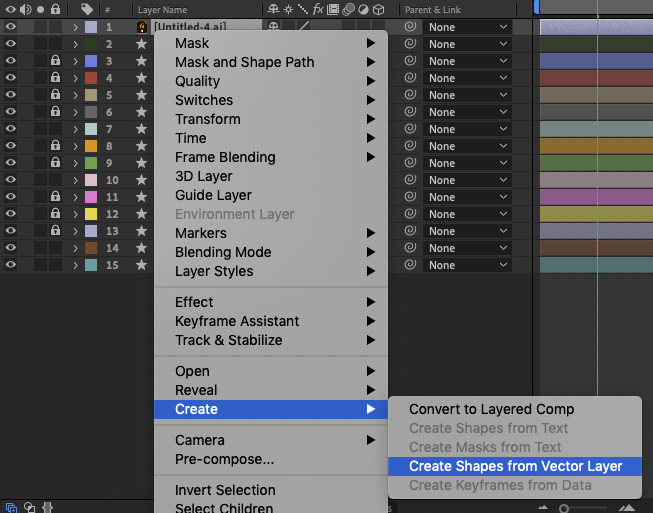 - Create your vector illustrations, for example in Adobe Illustrator. These files can be converted to shapes in After Effects. You can do this by right clicking on the layer, and choosing Create › Create Shapes from Vector Layer: