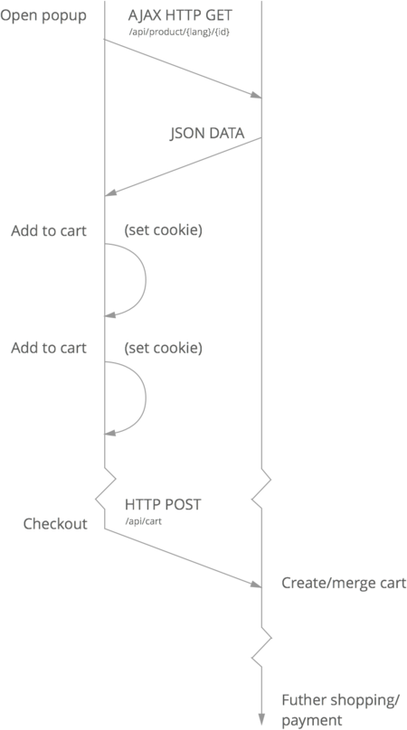 For checkout the user clicks the basket totals in the bottom right. A small popup menu appears which show a summary of products selected and a [Go to cart] button. The [Go to cart] button triggers a regular POST from a <form> DOM node to the web shop. The selected products are encoded as key-value pairs in the HTTP POST request. The POST request redirects to the relevant shopping cart based on the locale value in the query string.