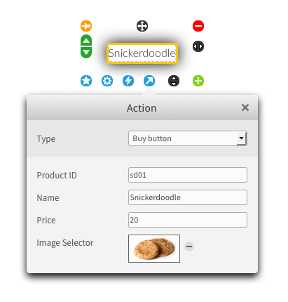 . Then choose "Buy button" as the action type. You can then enter a product ID, name, price and image. These will be displayed when a customer adds the product to their shopping cart.