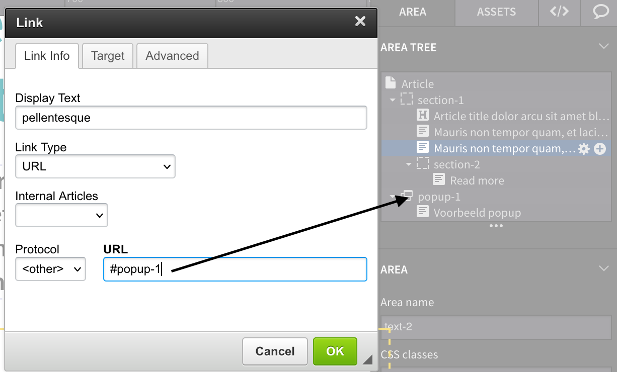 - Set up the pop-up: A pop-up window will appear with settings. Insert a hash symbol (#) followed by the name of the desired pop-up (area-name). Click "OK" to confirm and save the changes.