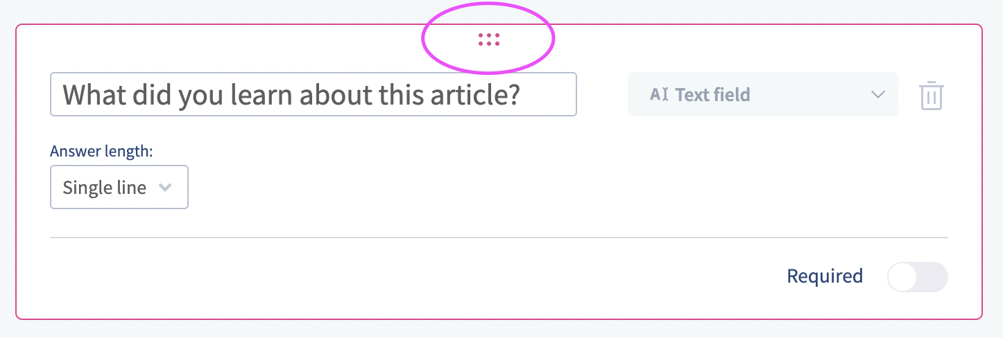 After adding question you are able to change the order at any time. In the top of every question there are 6 dots, this is the drag handle. Click on the dots to change the order of a question.