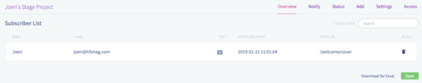 You can see an overview of all your subscribers in the subscriber list of your project. In this list you are able see the information your subscribers used when subscribing. If you entered additional fields in your settings you will also be able to view them here.